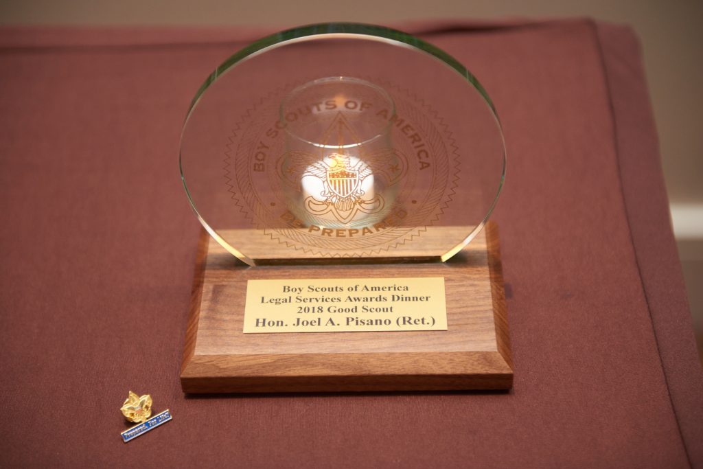 NEWARK, NJ, November 2, 2018 – Walsh’s Hon. Joel A. Pisano was honored by the Boy Scouts of America at the Patriot’s Path Council’s 2018 Legal Services Awards Dinner in Newark, NJ on November 1, 2018.